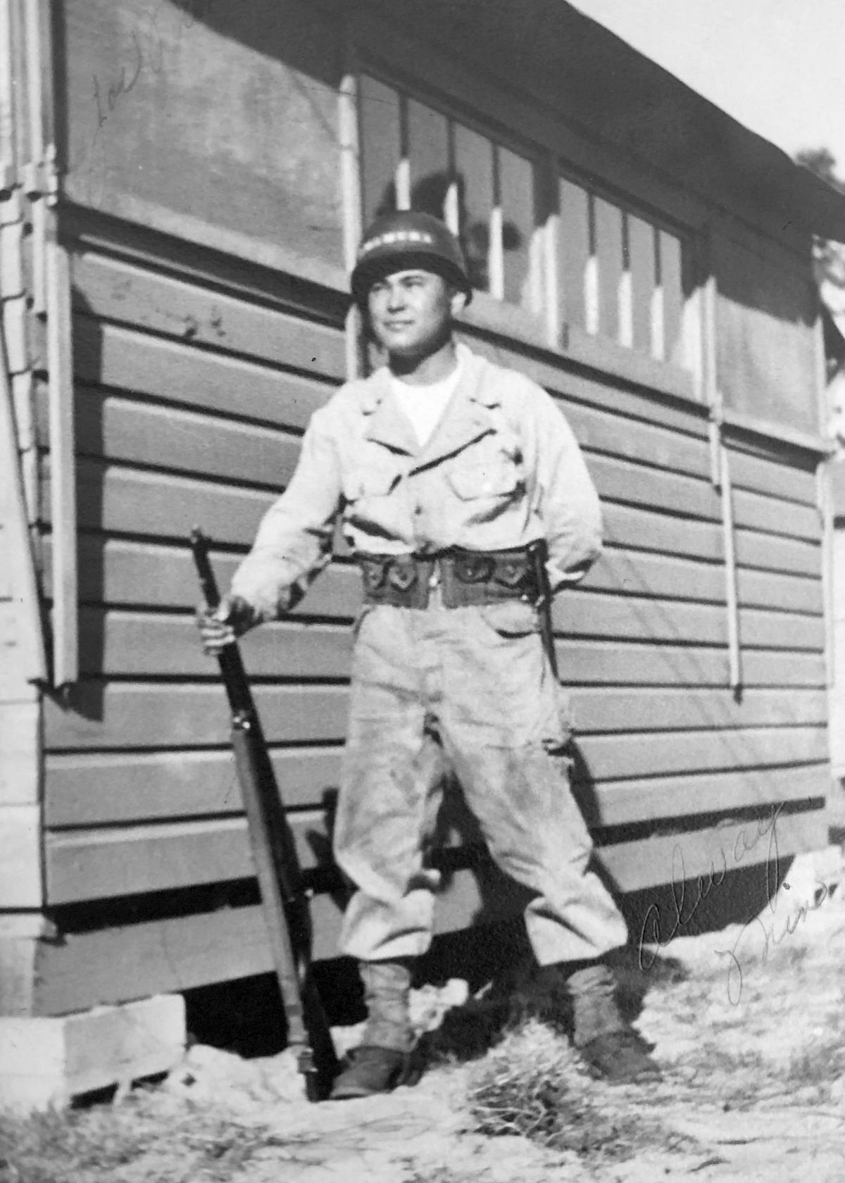 A year later, Min received a notice that he had been drafted into the U.S. army. He had just turned 18 and still hadn’t finished high school, so he petitioned — with success — to be allowed to graduate before entering the army. He eventually enlisted the following year and was sent to Camp Blanding, a military training base in northeastern Florida. There, he trained with other Japanese American men as replacements for the 442nd Regimental Combat Team (RCT) , a segregated, all-Japanese American unit that had spent the past two years fighting in Europe.