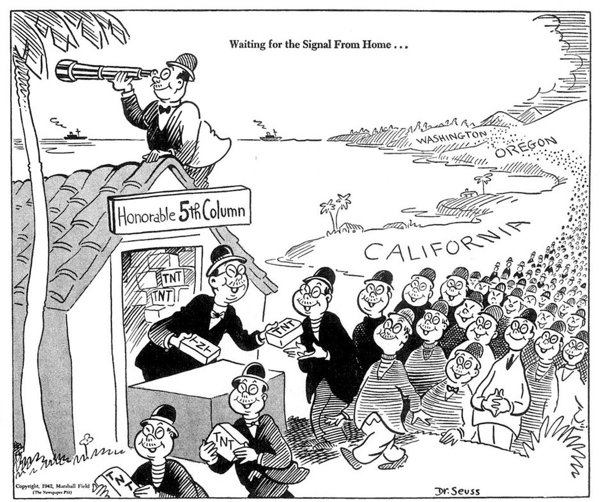 Soon, however, anti-Japanese sentiment reached a fever pitch. Wartime propaganda stoked fears that Japanese Americans living near military bases on the West Coast were engaging in espionage, sabotage, and surveillance. There were economic interests at play, too — white farmers who felt threatened by Japanese Americans’ success in agriculture fervently spoke about the disloyalty of Japanese Americans and lobbied for removing the entire community from the West Coast.